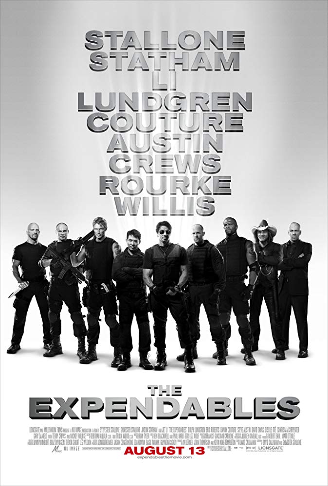 The title team, which includes Barney Ross (Stallone), Lee Christmas (Statham), Ying Yang (Li), Gunner (Lundgren), Toll Road (Couture), and Hale Cesear (Crews) is introduced as a gang of highly skilled ex-military men for hire that go to the highest bidder. We know that one of them is a drug user, but we don’t know what drugs he does or even why he does them. This member is kicked to the curb, while the others consider a new job that involves assassinating the brutal Latin American dictator of an island.  After Ross and Christmas travel to the island to scout the mission, the men discover that things are more complicated than they seem; American businessmen are bankrolling the dictator so that they can exploit the island’s natural resources.